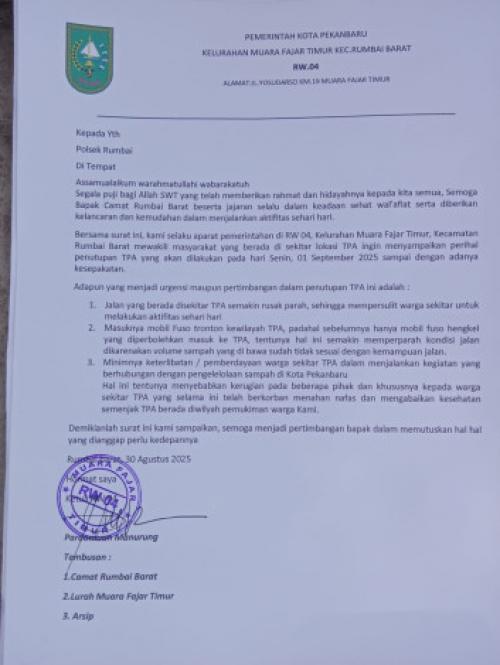 Selasa, 02-09-2025 - 08:41:01 WIB Riau12.com-PEKANBARU – Warga RW 04 Kelurahan Muara Fajar Timur, Kecamatan Rumbai Barat, Kota Pekanbaru, melayangkan surat resmi permintaan penutupan Tempat Pembuangan Akhir (TPA) di wilayah mereka. Surat tertanggal 30 Agustus 2025 itu ditujukan kepada Polsek Rumbai, serta ditembuskan ke Camat Rumbai Barat dan Lurah Muara Fajar Timur.Dalam...(read more)