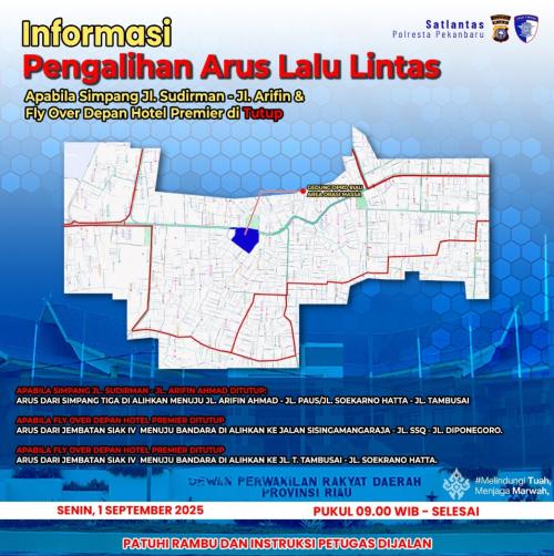 Senin, 01-09-2025 - 08:41:06 WIB Riau12.com-PEKANBARU – Satuan Lalu Lintas (Satlantas) Polresta Pekanbaru menerapkan rekayasa lalu lintas untuk mengantisipasi kemacetan akibat aksi unjuk rasa mahasiswa di depan Kantor DPRD Riau, Senin (1/9/2025).Aksi yang dimulai sekitar pukul 09.00 WIB ini melibatkan sekitar seribu mahasiswa yang menyampaikan aspirasi mereka di Jalan...(read more)