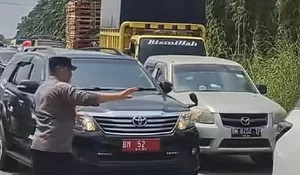 Polisi yang berada di lokasi tampak berusaha mengurai kemacetan dan akhirnya menginstruksikan sopir mobil dinas BM 52 tersebut, untuk sesuai dengan jalurnya, agar kendaraan yang berada di depannya bisa melintas.