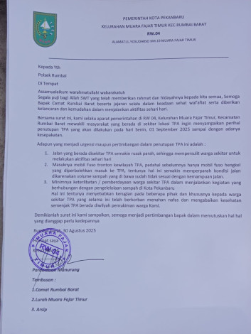 Riau12.com-PEKANBARU – Warga RW 04 Kelurahan Muara Fajar Timur, Kecamatan Rumbai Barat, Kota Pekanbaru, melayangkan surat resmi permintaan penutupan Tempat Pembuangan Akhir (TPA) di wilayah mereka. Surat tertanggal 30 Agustus 2025 itu ditujukan kepada Polsek Rumbai, serta ditembuskan ke Camat Rumbai Barat dan Lurah Muara Fajar Timur.