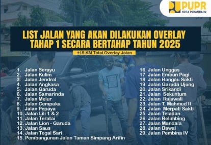 Riau12.com-Pekanbaru – Dinas Pekerjaan Umum dan Penataan Ruang (PUPR) Kota Pekanbaru akhirnya merilis daftar 29 ruas jalan yang akan diperbaiki melalui metode overlay sepanjang tahun 2025. Perbaikan tahap pertama ini menelan anggaran sekitar Rp88 miliar dari APBD Kota Pekanbaru.
