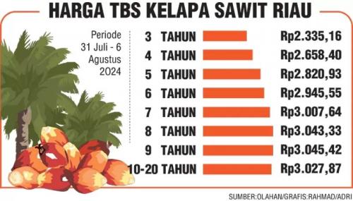 Rabu, 31-07-2024 - 11:30:16 WIB Riau12.com-PEKANBARU- Dinas Perkebunan Provinsi Riau bersama tim telah melaksanakan rapat penetapan harga kelapa sawit mitra plasma. Hasil penetapan harga kelapa sawit periode 31 Juli – 6 Agustus 2024 telah menggunakan tabel rendemen harga baru hasil kajian dari PPKS Medan yang disepakati oleh tim.Kepala Dinas Perkebunan Riau Syahrial Abdi...(read more)