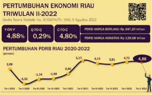 Jumat, 05-08-2022 - 13:35:45 WIB Riau12.com-PEKANBARU - Perekonomian Riau berdasarkan besaran Produk Domestik Regional Bruto (PDRB) atas dasar harga berlaku triwulan II-2022 mencapai Rp247,20 triliun dan atas dasar harga konstan 2010 mencapai Rp129,68 triliun."Ekonomi Riau triwulan II-2022 terhadap triwulan II-2021 mengalami pertumbuhan sebesar 4,88 persen (y-on-y),"...(read more)