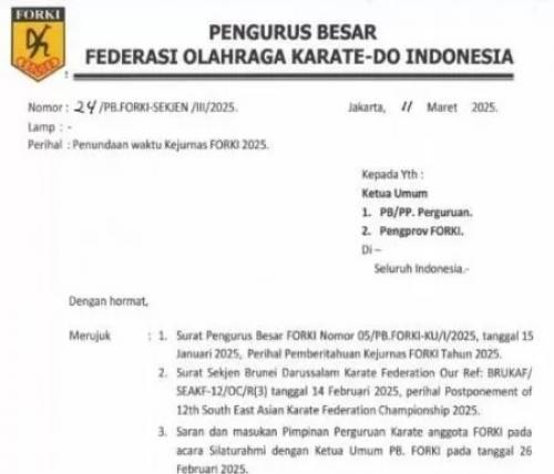 Jumat, 21-03-2025 - 09:00:33 WIB Riau12.com-PEKANBARU – Kejuaraan Nasional (Kejurnas) Karate yang memperebutkan Piala Ketua Umum (Ketum) Forki III dan Piala Gubernur Riau, yang semula dijadwalkan pada 15-17 April 2025, terpaksa ditunda. Kejuaraan bergengsi ini akan digelar pada 16-18 Mei 2025, memberikan waktu lebih bagi para atlet dan panitia untuk...(read more)