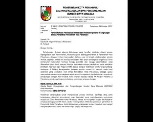 Sabtu, 25-10-2025 - 13:32:15 WIB Riau12.com-Pekanbaru – Beredar surat yang mengatasnamakan Badan Kepegawaian dan Pengembangan Sumber Daya Manusia (BKPSDM) Kota Pekanbaru terkait proses mutasi guru di sejumlah sekolah. Surat tersebut mencatut nama Kepala BKPSDM Pekanbaru, Samto, lengkap dengan tanda tangan elektronik dan nomor kontak yang bukan...(read more)