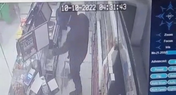 Aksi itu juga terlihat cukup cepat terjadi dimana tiba-tiba pelaku yang tampak menggunakan jaket dan helm mendobrak masuk gerai tersebut. Pelaku langsung menuju meja kasir dan menggeledah laci kotak uang.