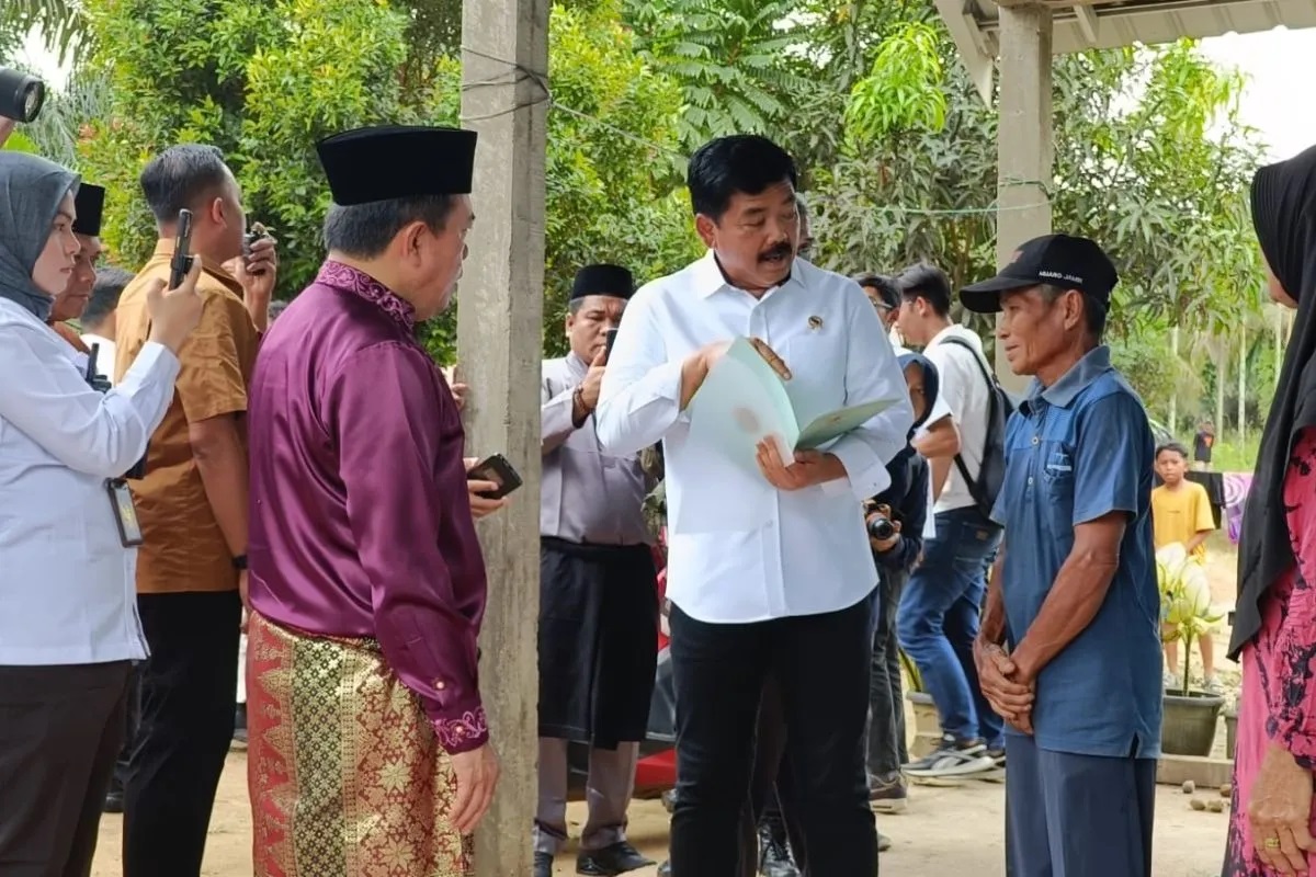 Usai menghadiri rangkaian HUT ke-67 Provinsi Jambi tahun 2024, Hadi Tjahjanto bersama Gubernur Jambi Al Haris langsung menyerahkan sertifikat tanah dan sertifikat rumah kepada warga di Desa Mekarjaya dan Talang Belido, Kecamatan Sungai Gelam, Kabupaten Muaro Jambi, Sabtu (6/1).
