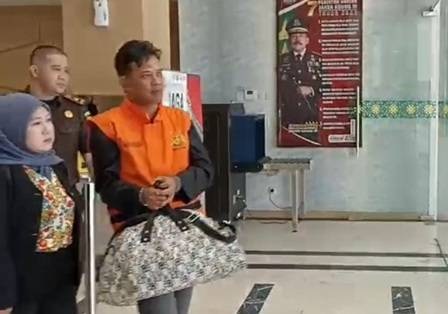 Setelah beberapa jam diperiksa, tersangka keluar dari ruang pemeriksan Pidsus Kejati Riau. Ia mengenakan rompi tahanan warna oranye, dan kedua tangan diborgol.