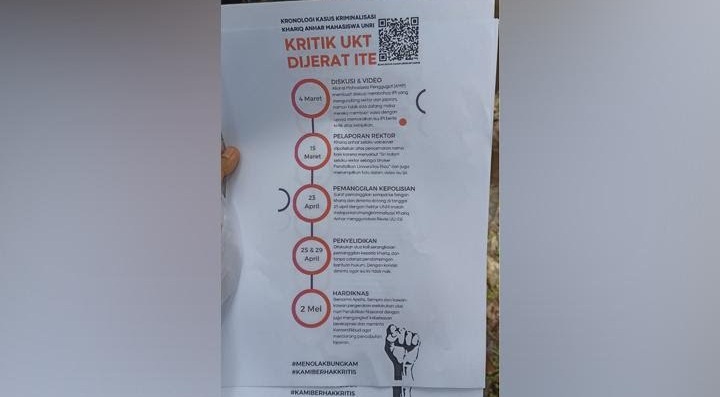 Sebelumnya, mahasiswa Fakultas Pertanian Unri, Khariq Anhar, dilaporkan Rektor Unri Sri Indarti ke Polda Riau. Khariq dituduh melanggar Undang-Undang Informasi dan Transaksi Elektronik setelah membuat konten video terkait mahalnya UKT dan IPI di Unri.
