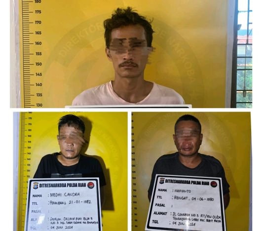 Direktur Reserse Narkoba Polda Riau, Kombes Pol Manang Soebeti mengatakan, ketiga pelaku berinisial MC (42) dan H (44) dan HAA alias Bule (37), warga Pekanbaru. Mereka ditangkap Selasa (4/6/2024) sekira pukul 18.30 WIB.