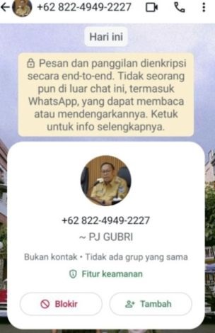 Tidak hanya itu, whatsapp penipuan itu juga ditemukan menggunakan foto profil Pj Gubri Rahman Hadi.