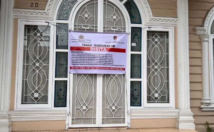 Berdasarkan pantauan di lokasi, terlihat spanduk penyegelan yang mencantumkan nama Subdit III Ditreskrimsus Polda Riau. Pada spanduk tersebut, tertulis dasar penyitaan, antara lain: