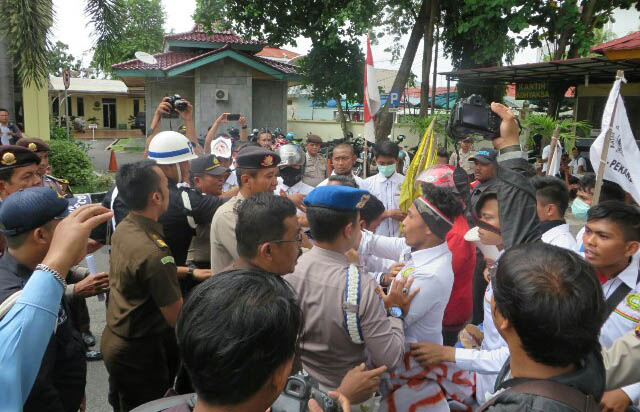 Massa pengunjukrasa terlibat saling dorong dengan sekuriti Kejati, karena mahasiswa ngotot untuk masuk ke dalam kantor untuk menemui Kepala Kejati Riau.