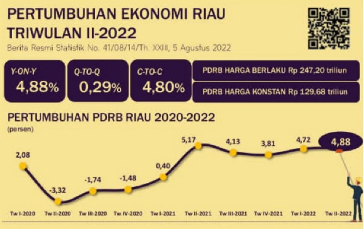 "Ekonomi Riau triwulan II-2022 terhadap triwulan II-2021 mengalami pertumbuhan sebesar 4,88 persen (y-on-y)," kata Kepala Badan Pusat Statistik (BPS) Provinsi Riau, Misfaruddin di Pekanbaru, Jumat (5/8/2022).