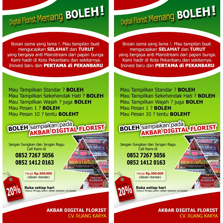 Riau12.com-PEKANBARU-Menjadi yang pertama hadir di Kota Pekanbaru, Akbar Digital Florist memberikan nuansa yang berbeda dalam menyampaikan pesan berupa ucapan hari bahagia, pelantikan, ucapan duka, ulang tahun, hari pernikahan dan ucapan lainnya. Dengan mengambil konsep digital printing, Akbar Digital Florist siap bersaing dan siap mengambil hati para konsumennya.