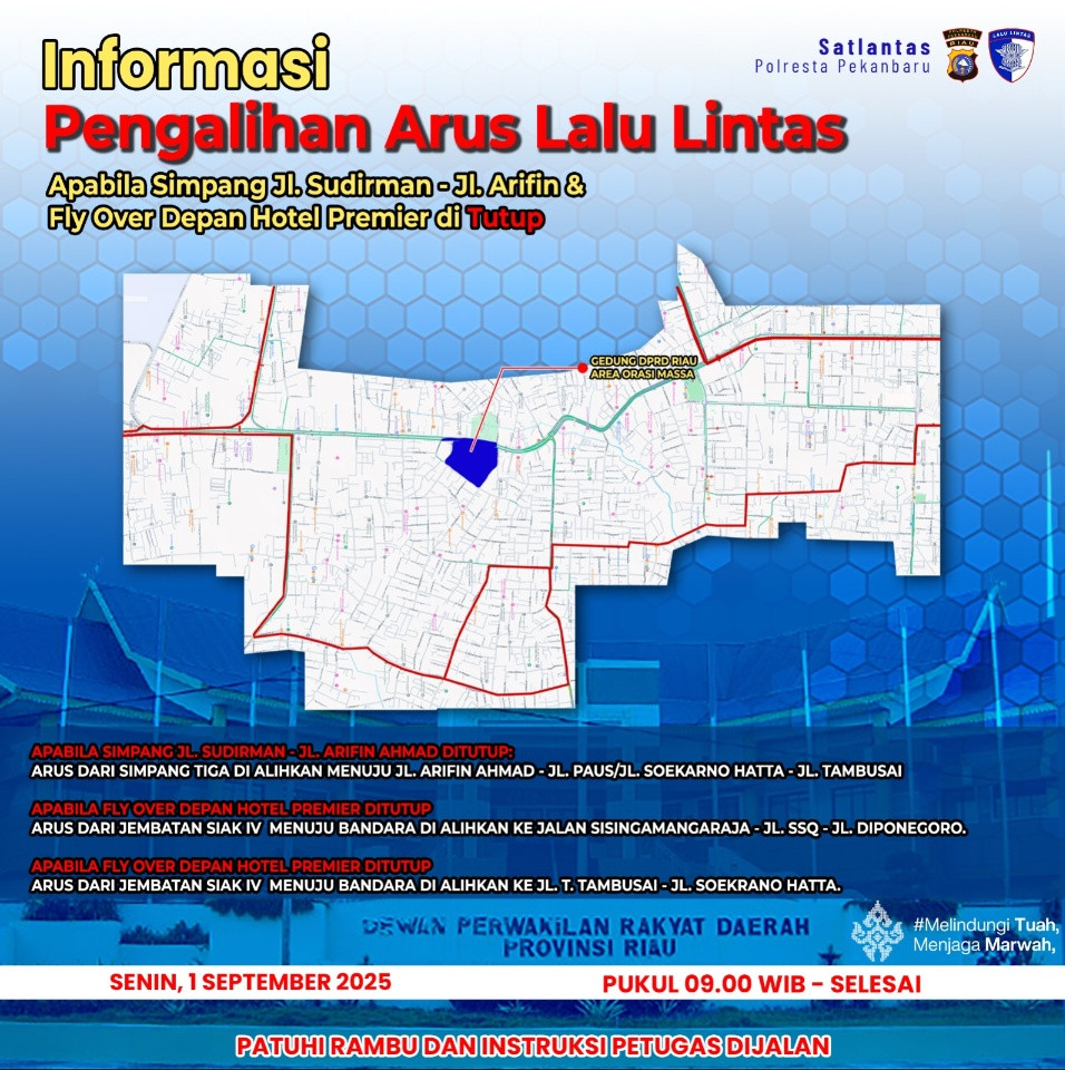 Riau12.com-PEKANBARU – Satuan Lalu Lintas (Satlantas) Polresta Pekanbaru menerapkan rekayasa lalu lintas untuk mengantisipasi kemacetan akibat aksi unjuk rasa mahasiswa di depan Kantor DPRD Riau, Senin (1/9/2025).