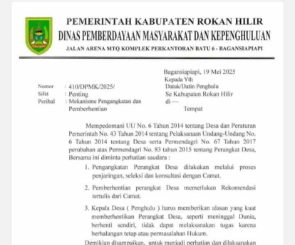 Padahal, dalam Surat Nomor: 410/DPMK/2025 tertanggal 19 Mei 2025, Dinas PMK telah mengingatkan seluruh Pj Datuk dan Datin untuk tidak melakukan penggantian perangkat desa. Surat itu mengacu pada ketentuan Undang-Undang Nomor 6 Tahun 2014, Peraturan Pemerintah Nomor 43 Tahun 2014, serta Permendagri Nomor 67 Tahun 2017 tentang perangkat desa.