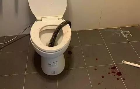 Insiden ini membuat kamar mandinya berlumuran darah setelah dia berhasil memukuli ular tersebut sampai mati untuk melepas gigitannya menggunakan sikat toilet.
