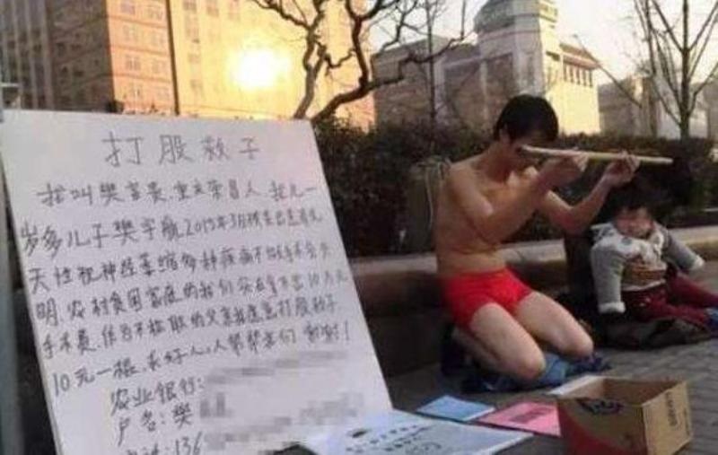 Pria itu berlutut, mengenakan celana pendek berwarna merah, dan memegang sebatang tongkat kayu di depan sebuah stasiun kereta api serta ditemani oleh istri dan anaknya. Tak lupa, ia membawa poster berisikan penjelasan mengenai penyakit yang diderita anaknya.