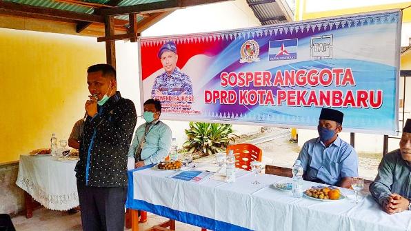 Teks : Suasana Sosialisasi Perda Nomor 13 Tahun 2018, Tentang Penempatan Tenaga Kerja Lokal oleh Wakil Ketua DPRD Pekanbaru T Azwendi Fajri SE, di Jalan Kaharuddin Nasution, RT 01 RW 08 Kelurahan Air Dingin, Kecamatan Bukit Raya.