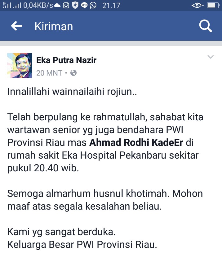 Riau12.com-PEKANBARU-Innalillahi wainnailaihi rojiun, Kabar duka datang dari dunia pers Riau. Wartawan senior yang juga mantan Pimred Metro Riau dan Bendahara PWI Riau, Ahmad Rodhi meninggal dunia di Rumah Sakit Eka Hospital Pekanbaru sekitar pukul 20.40 Wib. Meninggalnya Ahmad Rodhi disiarkan oleh sekretaris PWI Riau Eka Putra Nazir melalui akun facebooknya.