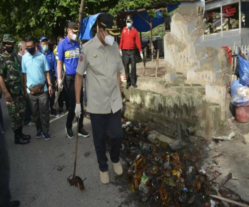 PEKANBARU-Wali Kota Pekanbaru Dr H Firdaus ST MT bersama Sekretaris Daerah (Sekda) Kota Pekanbaru Muhammad Jamil ikut membersihkan sampah di parit, Ahad (20/12/2020) di Jalan Letkol Hasan Basri.